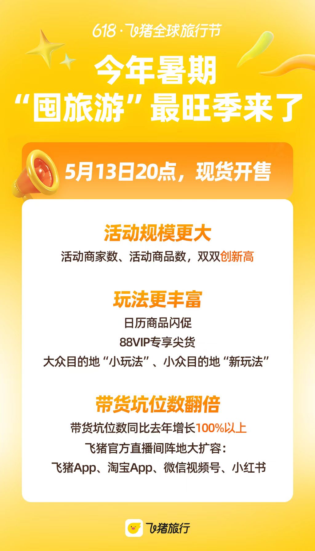 上证报中国证券网讯(记者 宋薇萍)记者5月12日从飞猪平台获悉,5月13日晚8点,2025年飞猪618现货开售,销售日期持续至6月20日24点,暑期的第一波“囤旅游”浪潮即将来临。